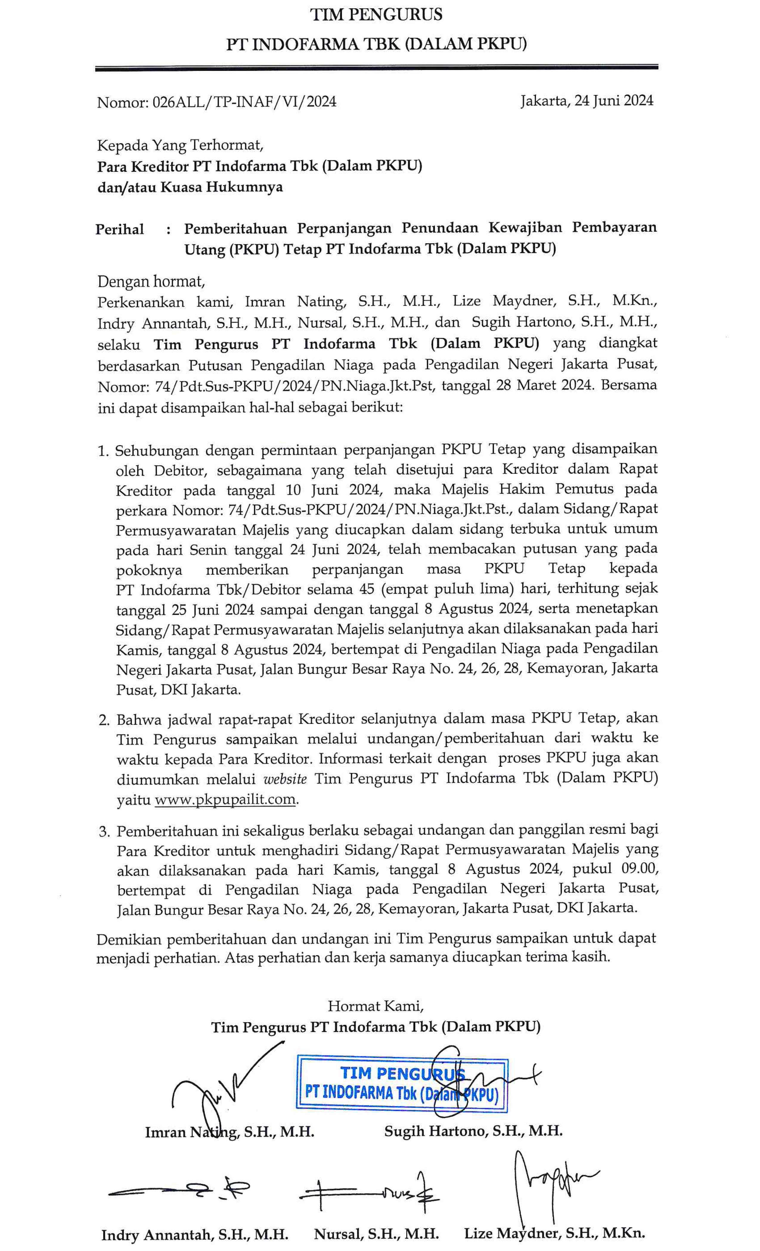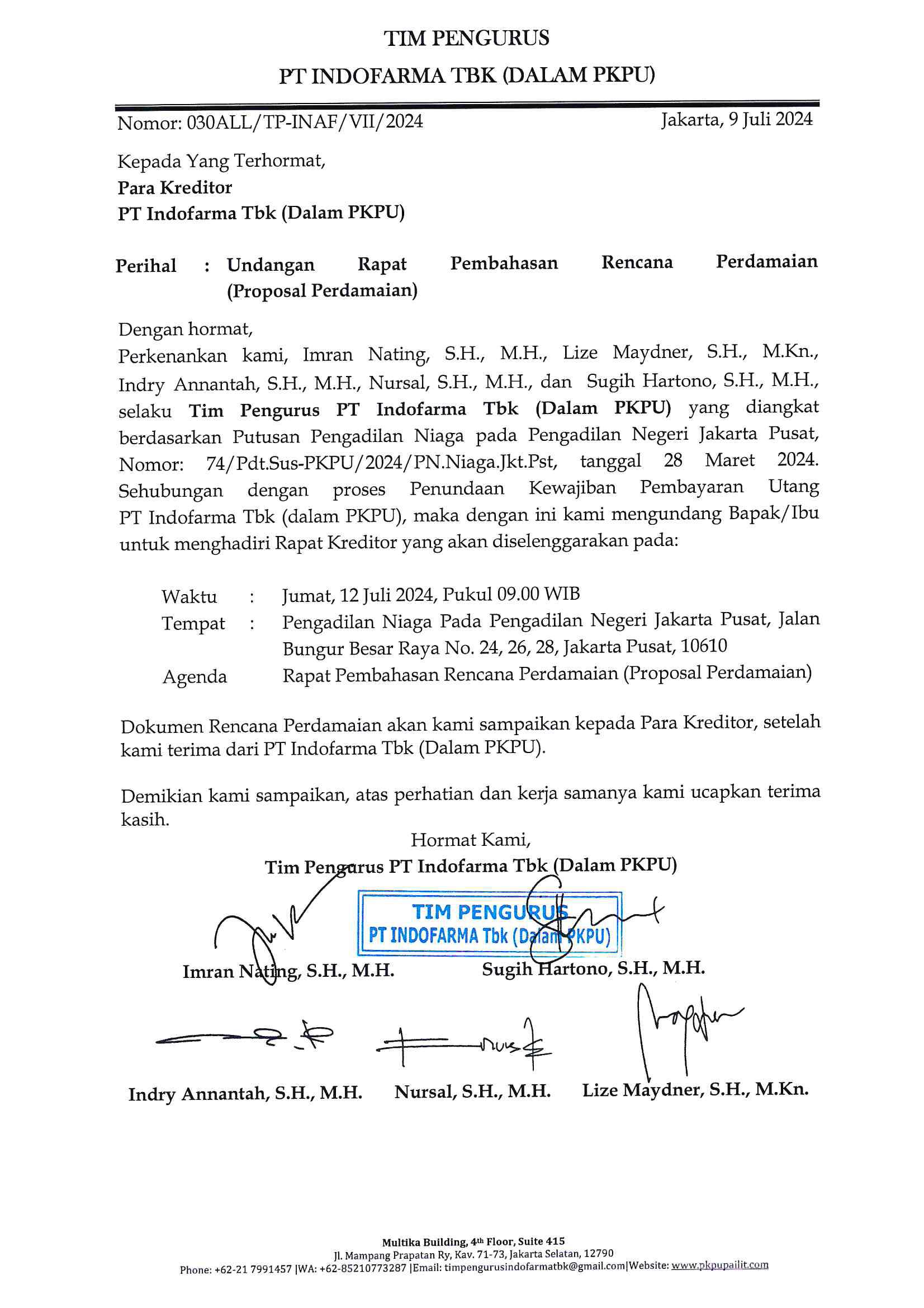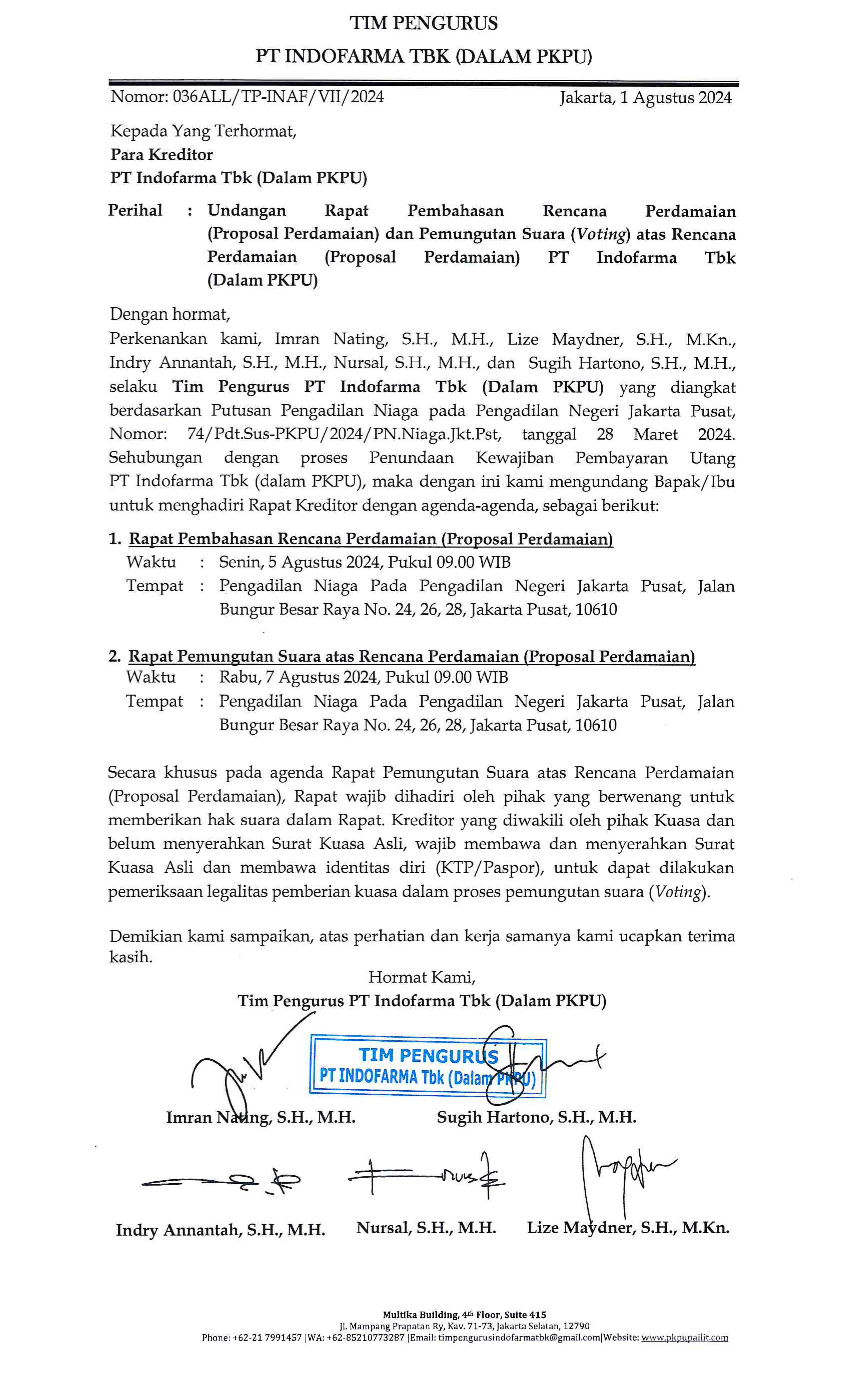 UNDANGAN RAPAT PEMBAHASAN RENCANA PERDAMAIAN DAN VOTING INAF-1 PT INDOFARMA (Dalam PKPU)